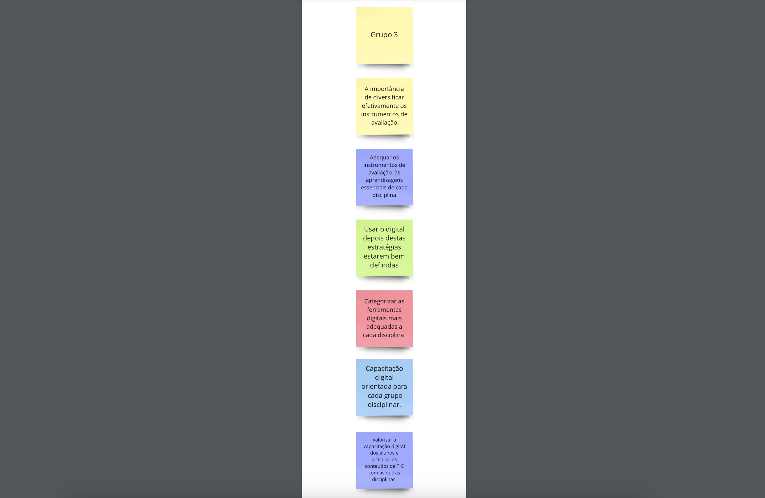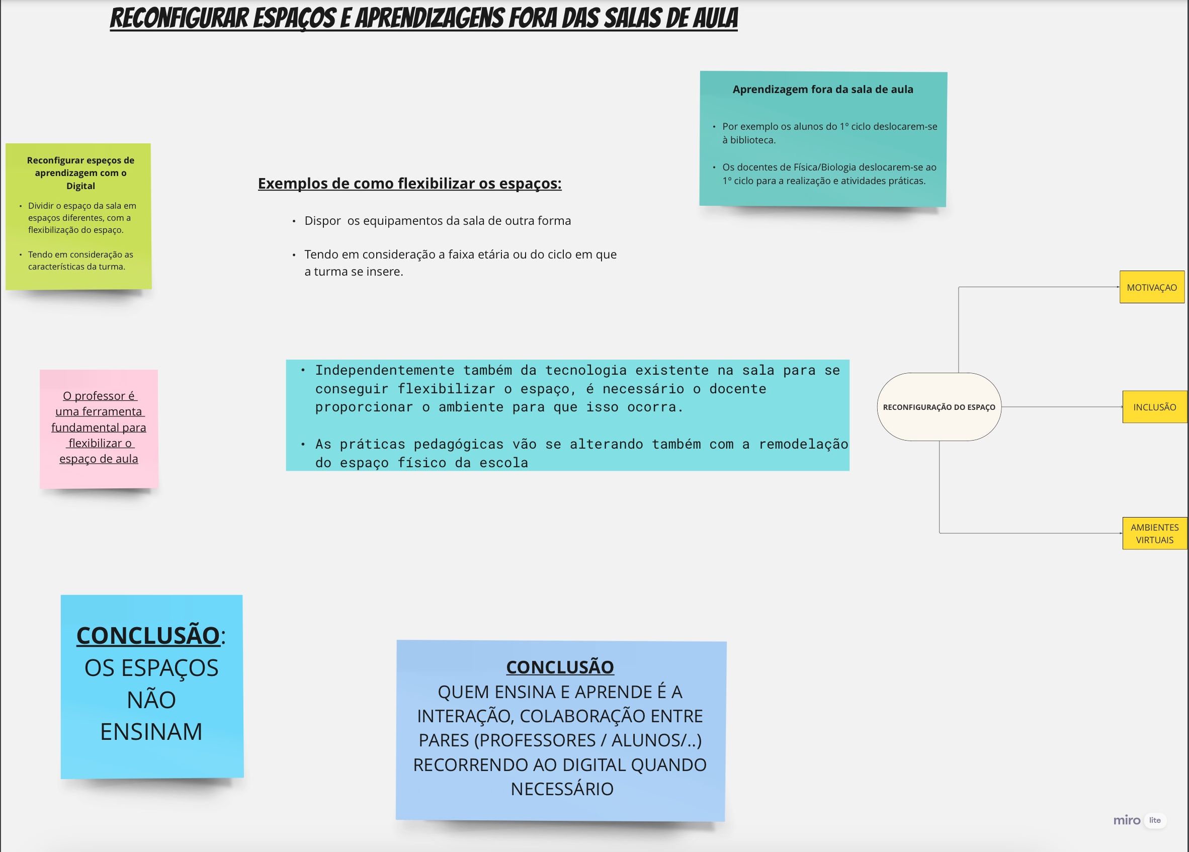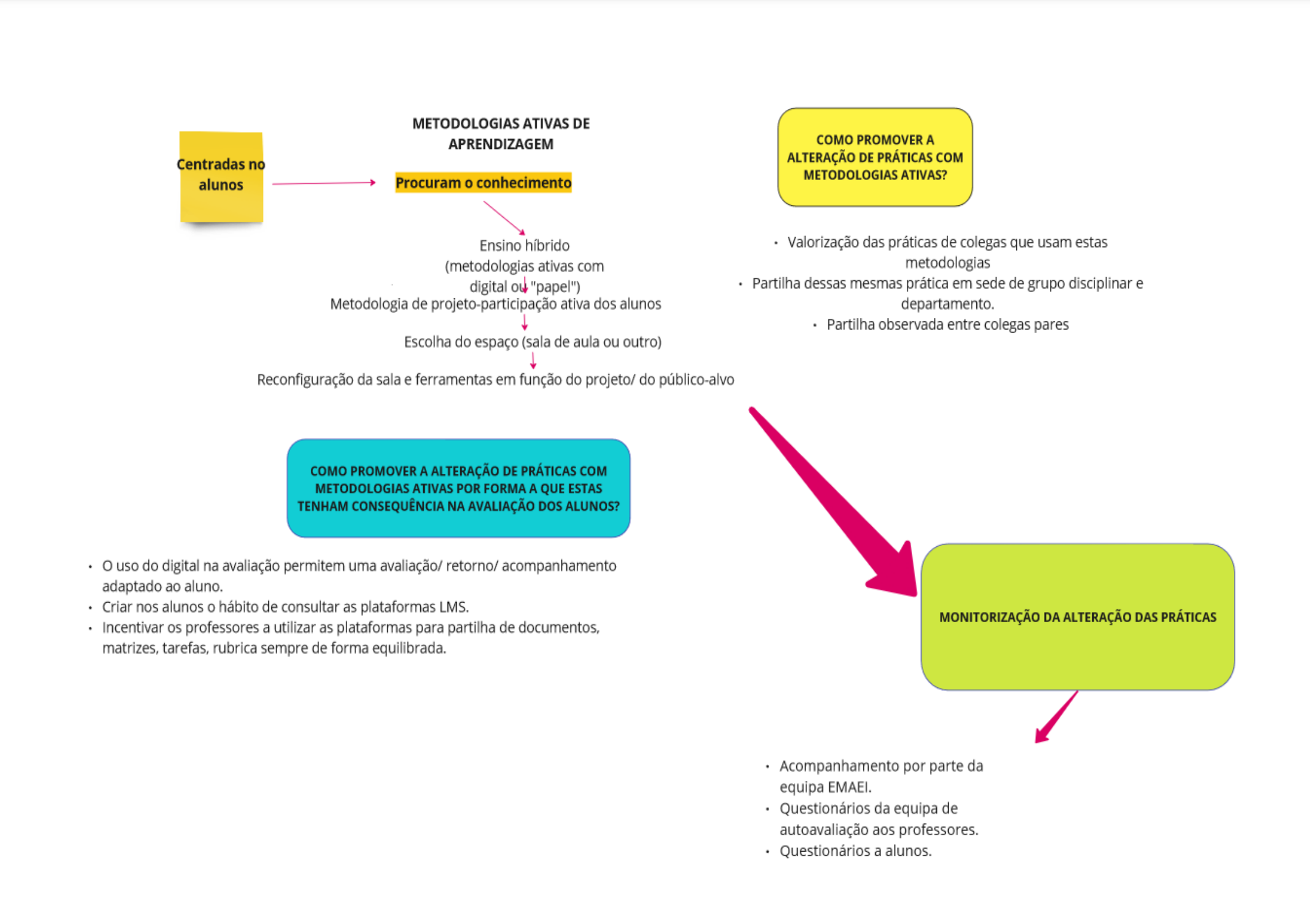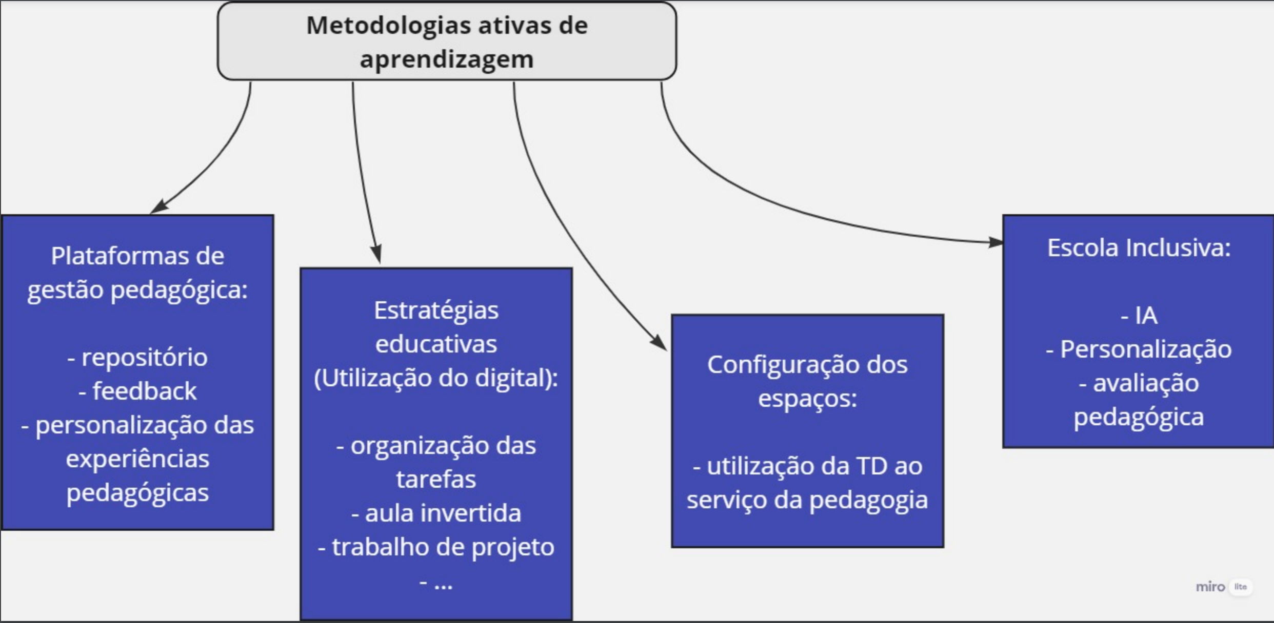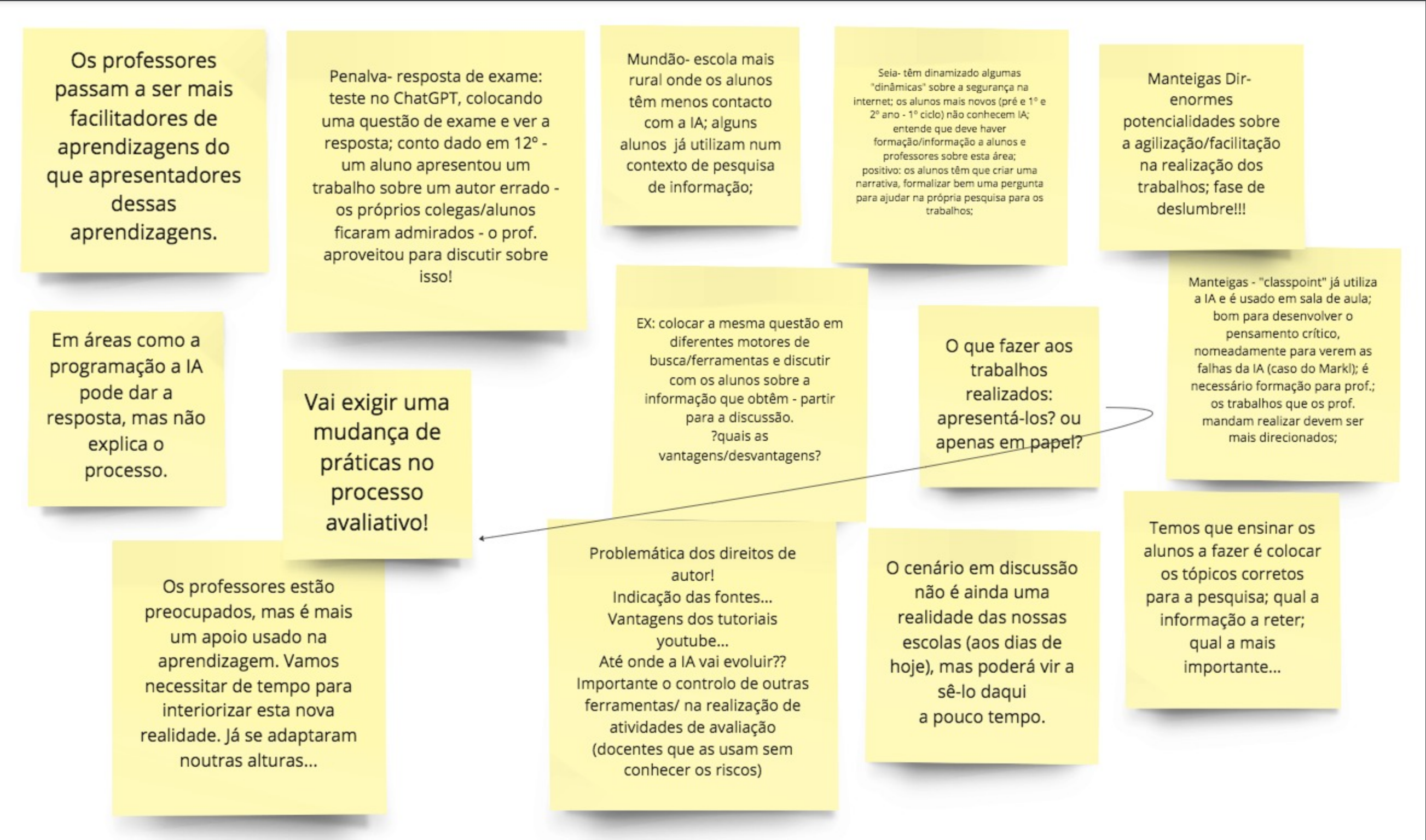 - Foram afloradas várias questões que associadas à utilização do digital vieram reascender o debate sobre metodologias de aprendizagem ativas, a possibilidade de integração ou recorrer a recursos que utilizem Inteligência Artificial (IA), a reconfiguração de espaços e consequentemente que implicações teria para a avaliação dos alunos e o feedback a proporcionar-lhes.