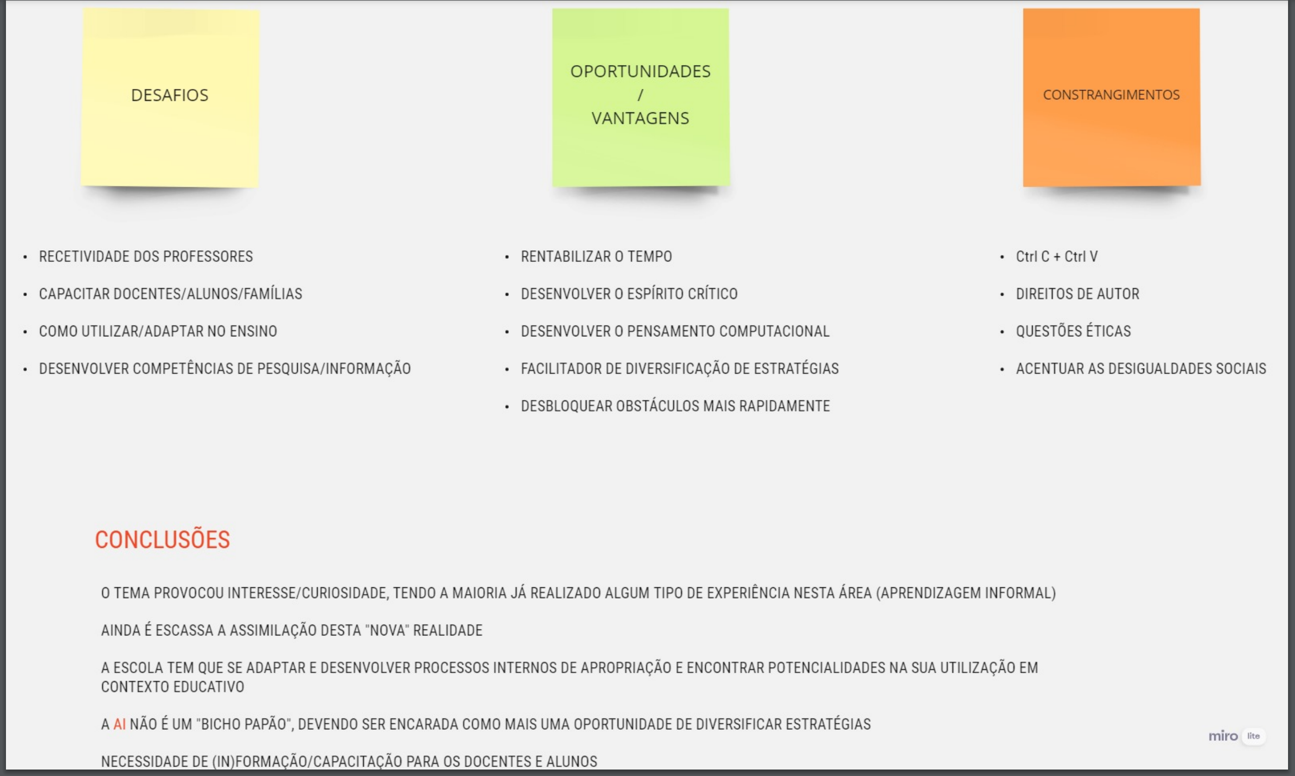 - Referir que, no que diz respeito à inteligência artificial, o grande desafio deste momento para as escolas, é a criação de referenciais de utilização da IA no contexto educativo, quando, como e onde pode ou não ser utilizada.