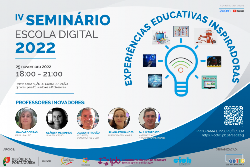No dia 25 de novembro p.f., entre as 18:00 e as 21:00, irá decorrer, online, o IV Seminário Escola Digital 2022, uma iniciativa do Centro de Competência TIC ESE/IPB Bragança. Este evento, dedicado a “experiências educativas inspiradoras”, dará voz aos professores que inovam pedagogicamente através do Digital.
