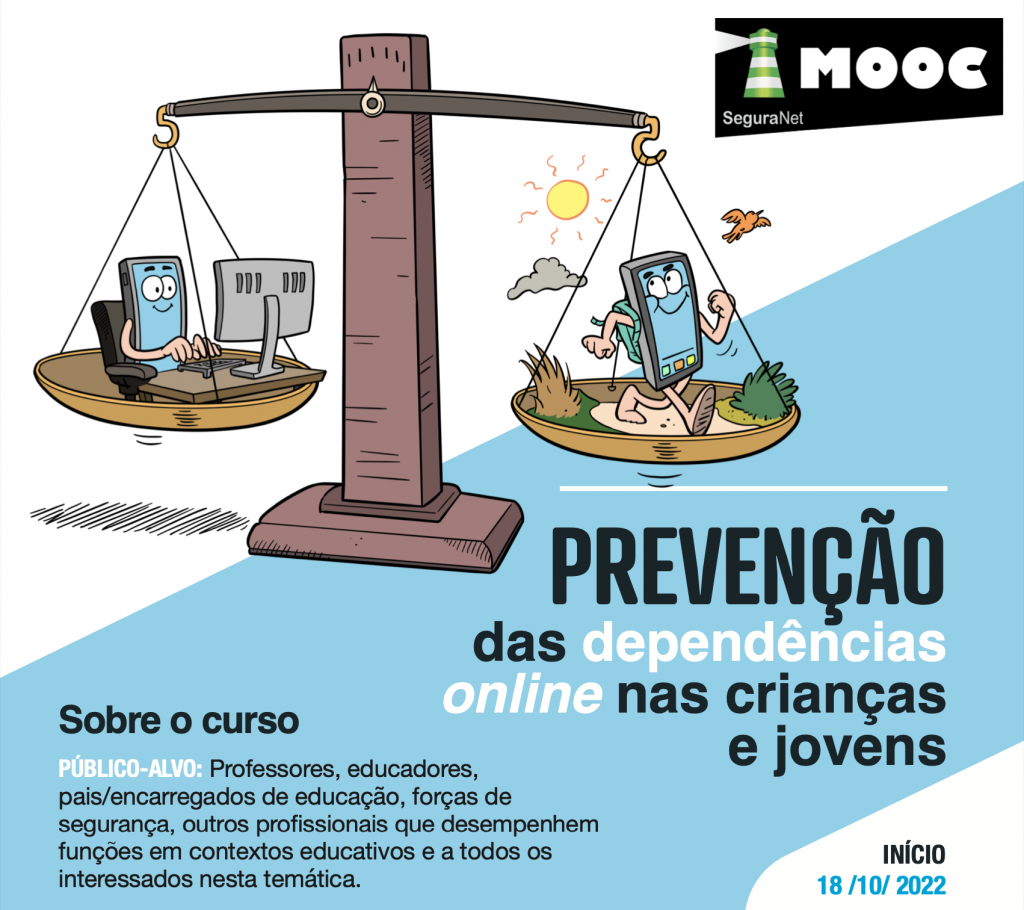 Inicia-se no próximo dia 18 de outubro o curso de formação “Prevenção das Dependências Online de Crianças e Jovens“, em formato MOOC (Massive Open Online Course). Promovido pela Direção-Geral da Educação (DGE), através do Centro de Sensibilização SeguraNet, este curso termina no dia 30 de dezembro de 2022, correspondendo a um trabalho global de cerca de 15 horas.